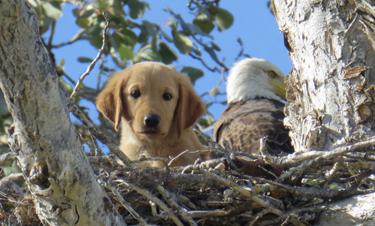 Stundenlang durchkämmte die Gruppe den dichten Wald und rief nach dem kleinen Hund. Sie suchten Lichtungen ab, folgten Bächen und blickten sogar auf die Spitzen der Felsklippen. Als die Hoffnung langsam schwand, zeigte jemand auf eine hohe Kiefer in der Ferne. Dort oben, zwischen den Ästen, thronte ein gewaltiges Nest. Könnte das das Zuhause des Adlers sein? Und könnte ihr Welpe tatsächlich dort oben sein?
