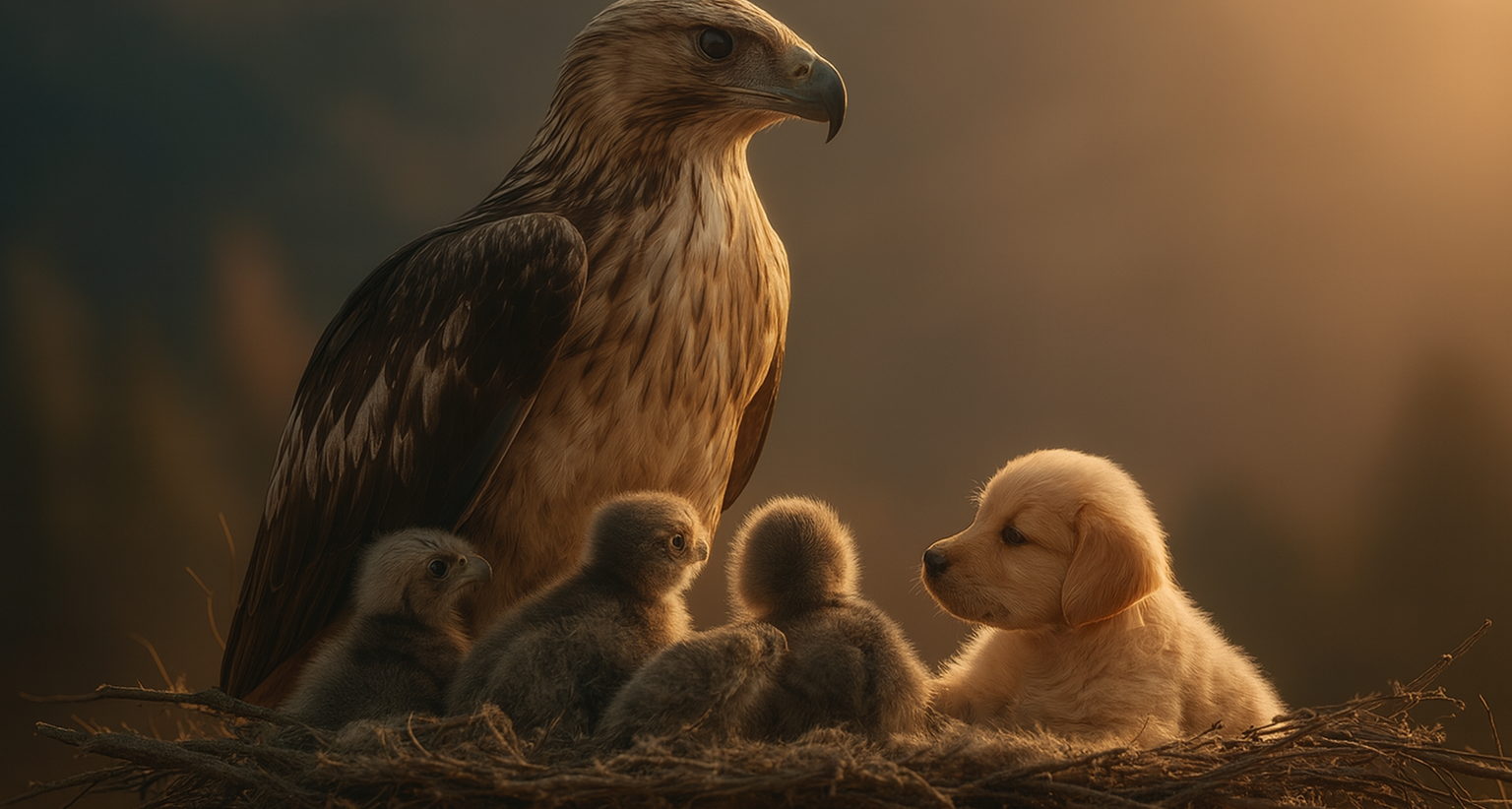 Zunächst wollte es keiner glauben. Der Welpe war weder verängstigt noch verletzt. Im Gegenteil, er spielte tatsächlich mit drei flauschigen Adlerküken. Der kleine Hund wedelte freudig mit dem Schwanz und stupste die Jungvögel an, als wären es seine Geschwister. Die Adlermutter stand ruhig am Rand des Nests und beobachtete die Szene. Nicht aggressiv, nicht abwehrend, sondern erstaunlich gelassen. Es wirkte, als hätte sie den kleinen Hund einfach in ihre Familie aufgenommen.